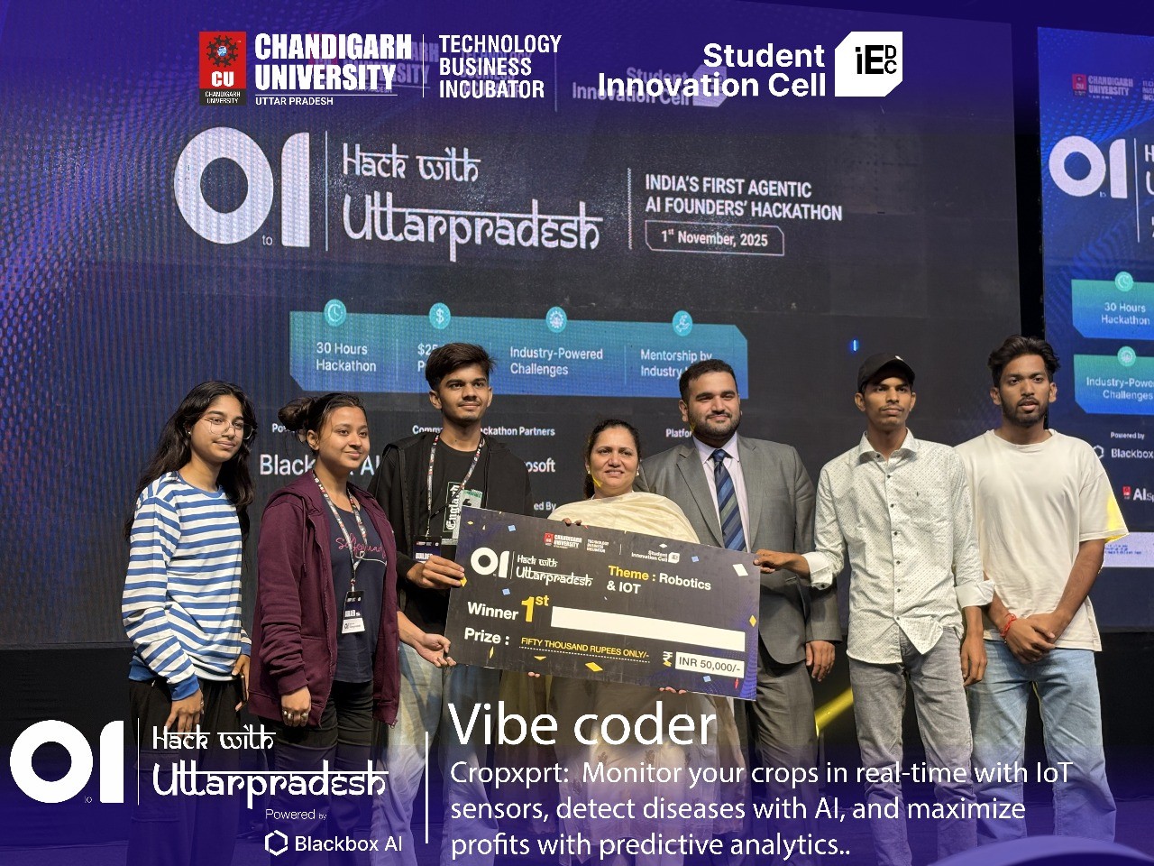 Team Vibe Coderz — a visionary group of student innovators — impressed judges at HackWithUttarPradesh 2025 with their startup-ready approach to solving real-world agricultural challenges through AI, robotics, and precision farming.